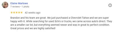 Brandon and his team are great. We just purchased a Chevrolet Tahoe and we are super happy with it. While searching for used SUVs or trucks, we came across auto’s direct. They are a smaller car lot, but everything seemed newer and was in great to perfect condition. Great prices and we are highly satisfied!