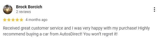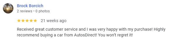 Received great customer service and I was very happy with my purchase! Highly recommend buying a car from AutosDirect! You won’t regret it!