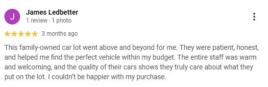 This family-owned car lot went above and beyond for me. They were patient, honest, and helped me find the perfect vehicle within my budget. The entire staff was warm and welcoming, and the quality of their cars shows they truly care about what they put on the lot. I couldn’t be happier with my purchase.