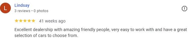 Excellent dealership with amazing friendly people, very easy to work with and have a great selection of cars to choose from.