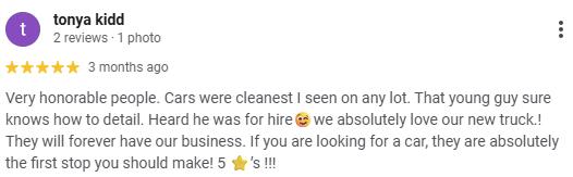 Very honorable people. Cars were cleanest I seen on any lot. That young guy sure knows how to detail. Heard he was for hire??we absolutely love our new truck.! They will forever have our business. If you are looking for a car, they are absolutely the first stop you should make! 5 ??’s !!!