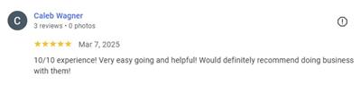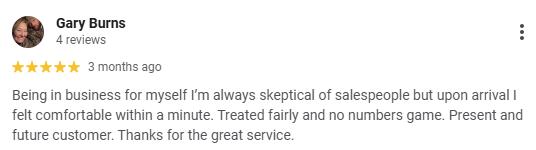 Being in business for myself I’m always skeptical of salespeople but upon arrival I felt comfortable within a minute. Treated fairly and no numbers game. Present and future customer. Thanks for the great service.