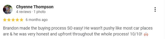 Brandon made the buying process SO easy! He wasn’t pushy like most car places are & he was very honest and upfront throughout the whole process! 10/10! ????