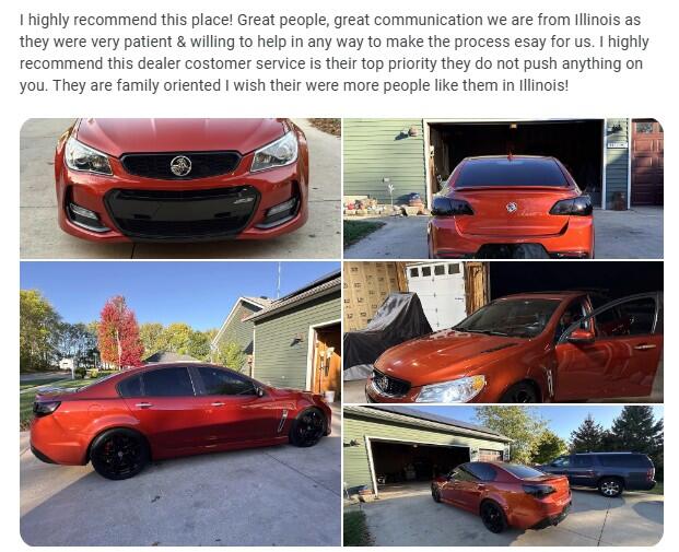 I highly recommend this place! Great people, great communication we are from Illinois as they were very patient & willing to help in any way to make the process esay for us. I highly recommend this dealer costomer service is their top priority they do not push anything on you. They are family oriented I wish their were more people like them in Illinois!