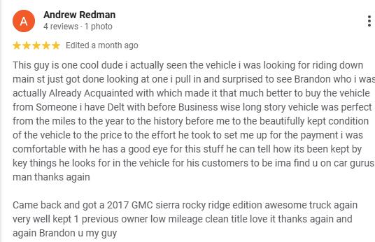This guy is one cool dude i actually seen the vehicle i was looking for riding down main st just got done looking at one i pull in and surprised to see Brandon who i was actually Already Acquainted with which made it that much better to buy the vehicle from Someone i have Delt with before Business wise long story vehicle was perfect from the miles to the year to the history before me to the beautifully kept condition of the vehicle to the price to the effort he took to set me up for the payment i was comfortable with he has a good eye for this stuff he can tell how its been kept by key things he looks for in the vehicle for his customers to be ima find u on car gurus man thanks again Came back and got a 2017 GMC Sierra rocky ridge edition awesome truck again very well kept 1 previous owner low mileage clean title love it thanks again and again Brandon u my guy!