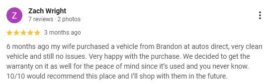 6 months ago my wife purchased a vehicle from Brandon at autos direct, very clean vehicle and still no issues. Very happy with the purchase. We decided to get the warranty on it as well for the peace of mind since it’s used and you never know. 10/10 would recommend this place and I’ll shop with them in the future.