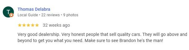 Very good dealership. Very honest people that sell quality cars. They will go above and beyond to get you what you need. Make sure to see Brandon he's the man!