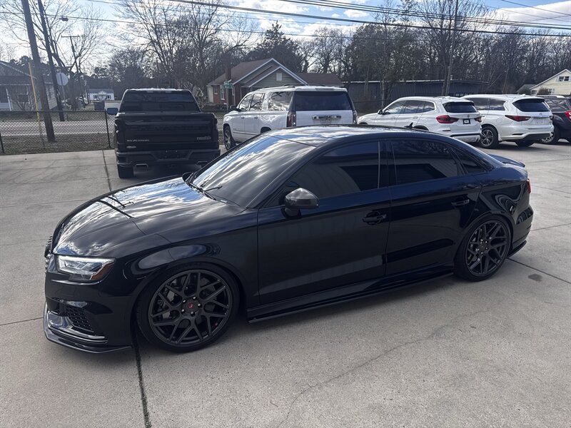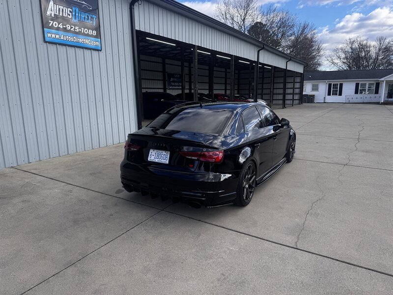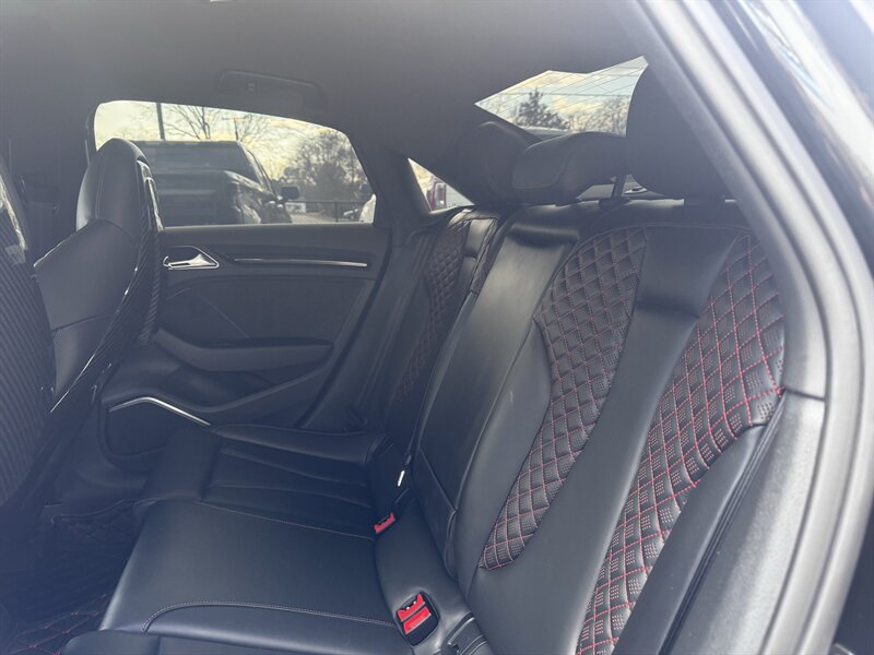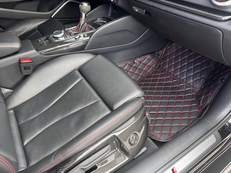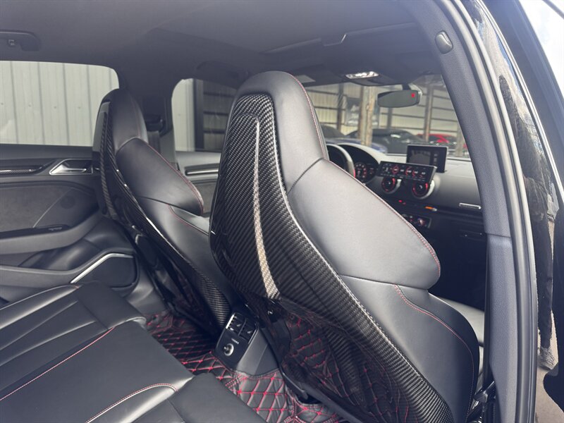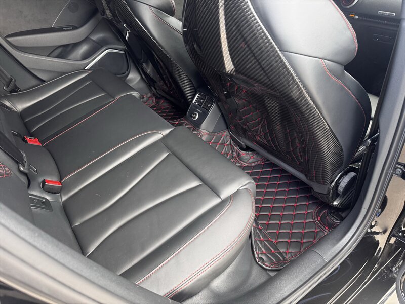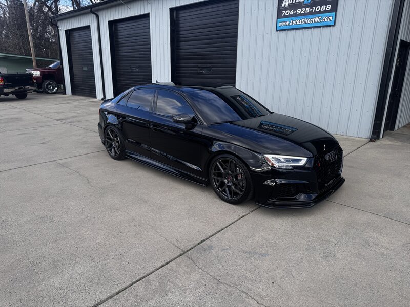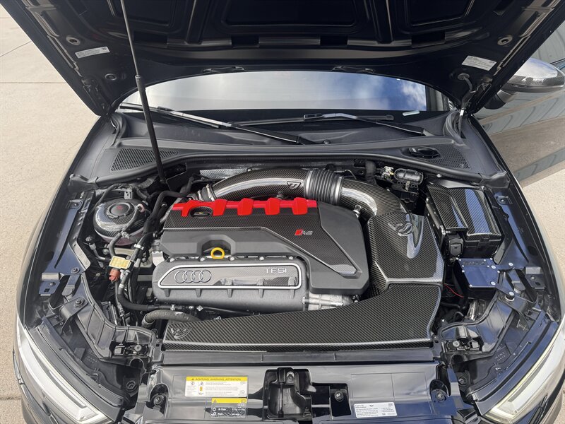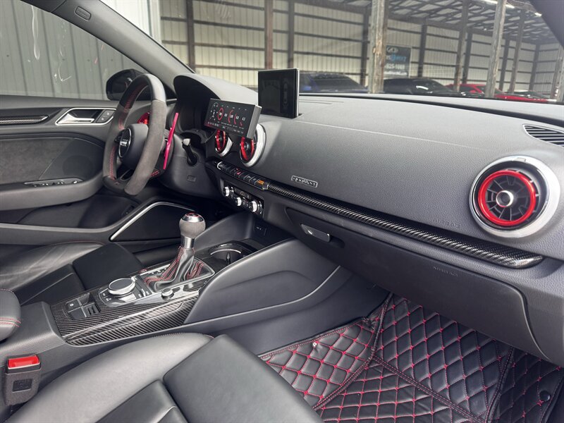 This is a weaponized 2018 Audi RS 3 — Mythos Black Metallic outside, Black interior with Crescendo Red stitching, under 18,000 miles (avg <2,000/yr), clean CARFAX, excellent condition. Powered by a 2.5L Turbo I5 pushing 700hp and 354 ft-lbs thanks to the TTE Stage 3 Hybrid Turbo Kit. Loaded with Black Optic, Dynamic, Dynamic Plus, RS Design and Technology packages plus RS Carbon inlays, leatherette door armrests/kneepads with Rock Gray stitching, full paint protection coverage and more.