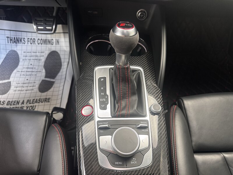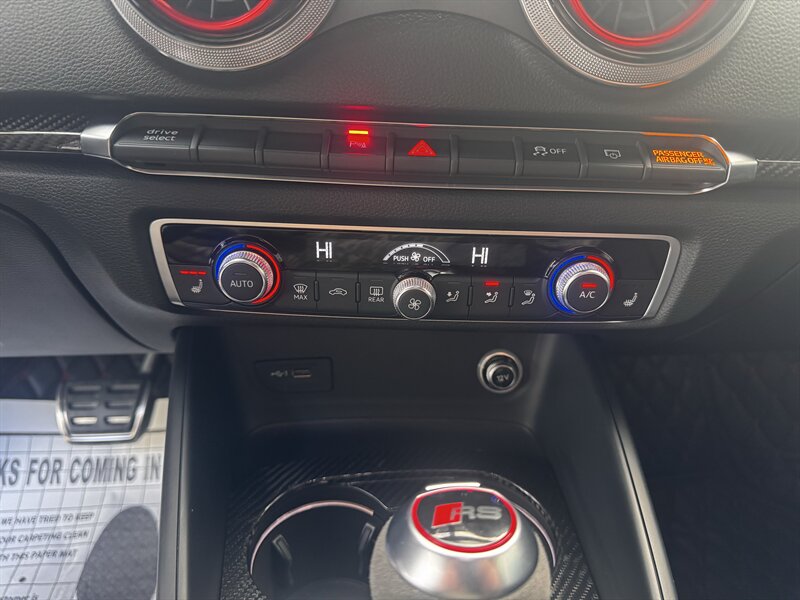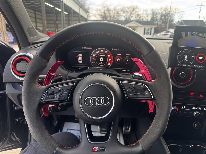 Factory-standard performance and tech (detailed): quattro all-wheel drive, RS-tuned sport suspension and chassis calibrations, factory RS performance brakes, quick 7-speed S tronic dual-clutch transmission with steering-wheel paddles, RS flat-bottom sport steering wheel, bolstered RS sport seats (premium leather/Alcantara styling), LED headlights/taillights, Audi MMI with navigation and connectivity, Audi drive select modes, advanced driver aids, dual-zone climate, parking sensors and rear camera — everything engineered for razor-sharp performance and daily usability.