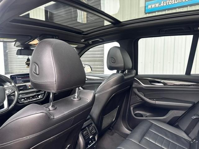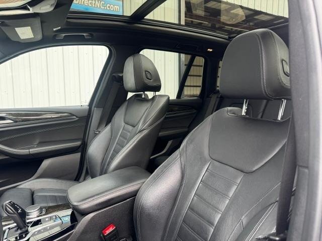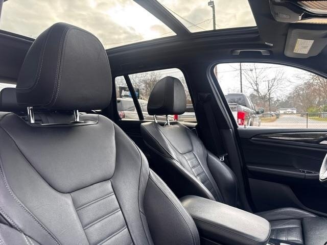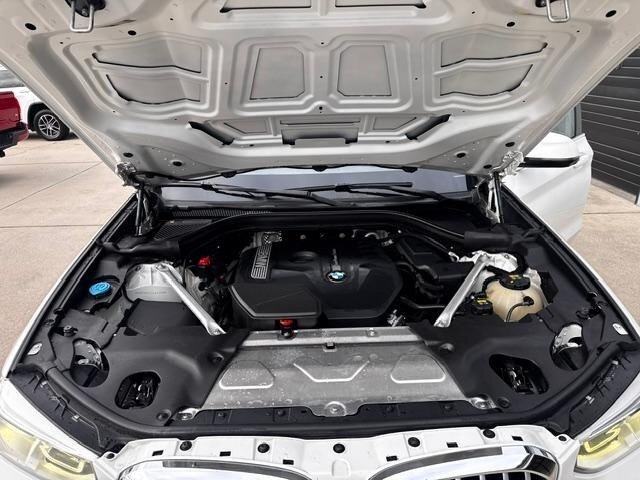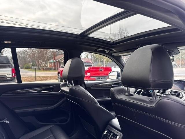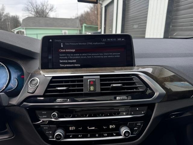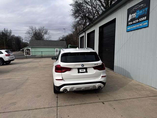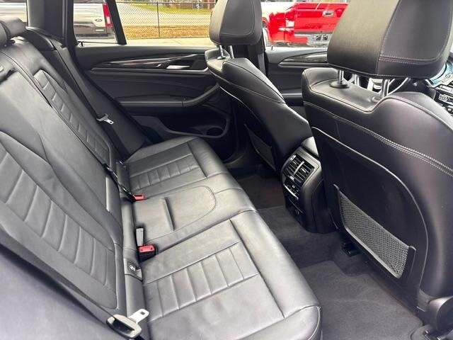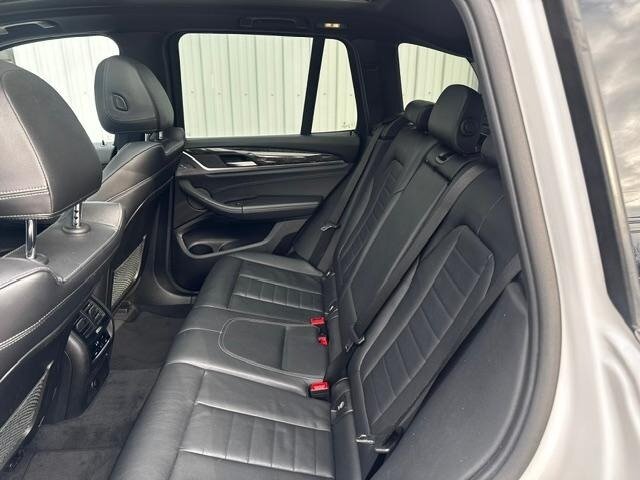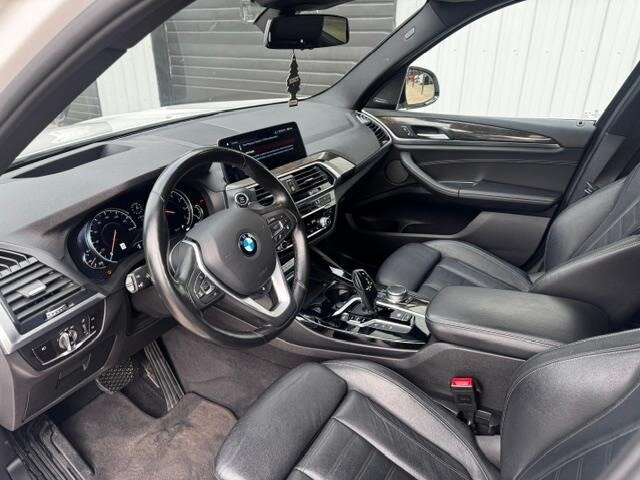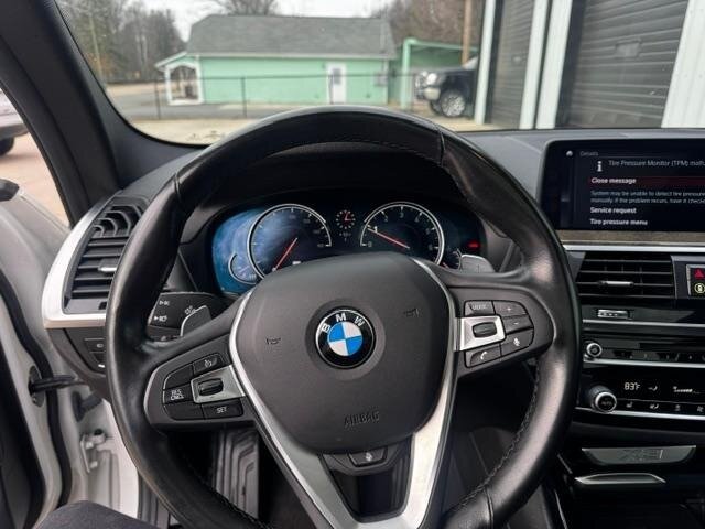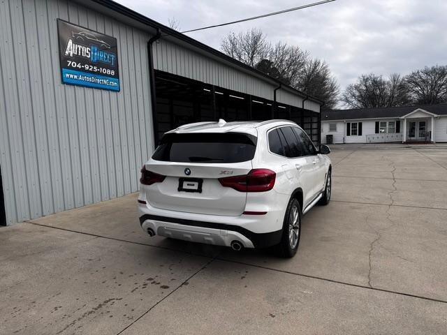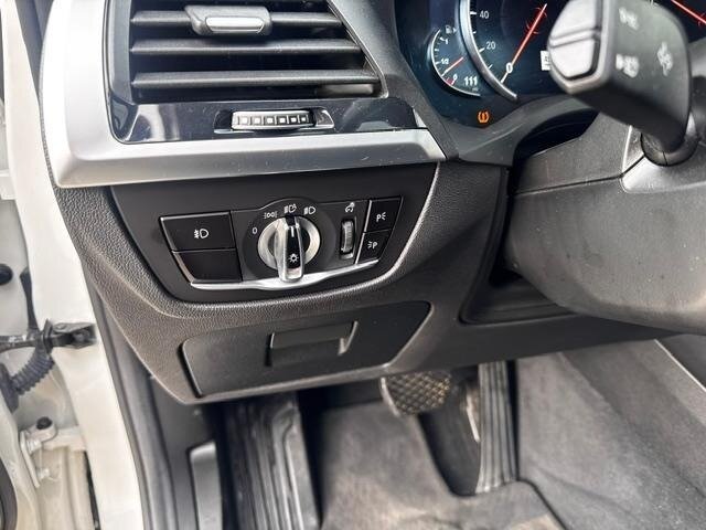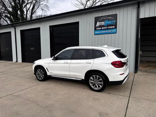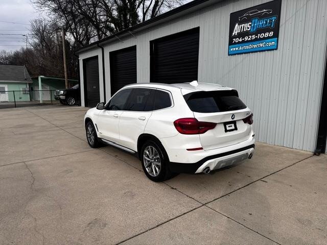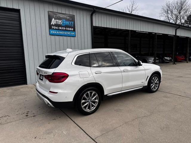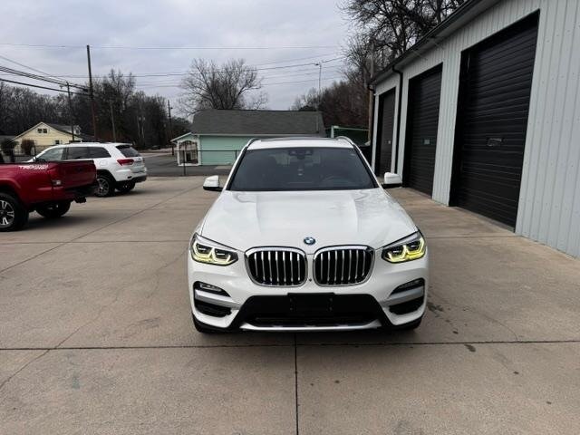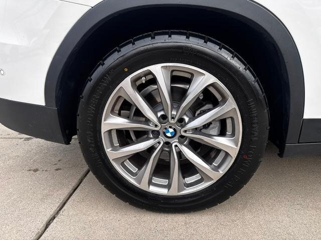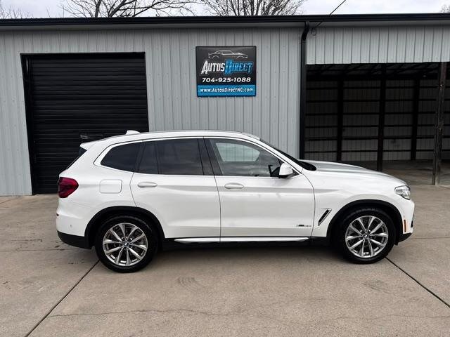 2018 BMW X3 xDrive30i — Mineral White Metallic exterior, Black interior. Powered by a 2.0L turbocharged I4 producing 248 hp and 258 lb-ft, paired with an eight-speed automatic transmission and BMW xDrive all-wheel drive; EPA-rated at 22 MPG city / 29 MPG highway. Factory-standard equipment includes ABS with traction and dynamic stability control, comprehensive airbag protection, power-operated front seats with lumbar support, dual-zone automatic climate control, a multifunction leather steering wheel, BMW iDrive infotainment with rotary controller plus Bluetooth and USB connectivity, cruise control and a backup camera. This example includes the Luxury Package and premium options: Harman Kardon surround sound, Grey Poplar wood interior trim, heated steering wheel, Mineral White Metallic paint, panoramic moonroof, front ventilated seats and factory navigation. Vehicle is in excellent overall condition with new tires.