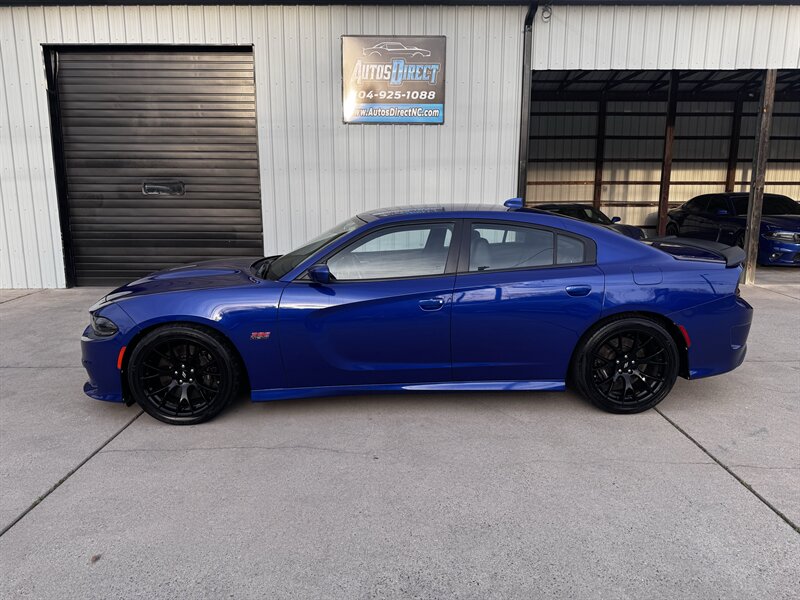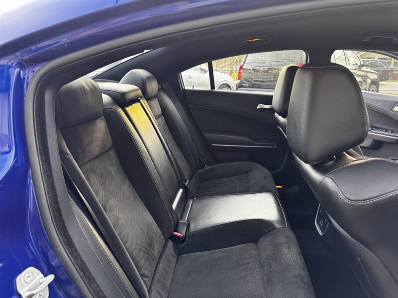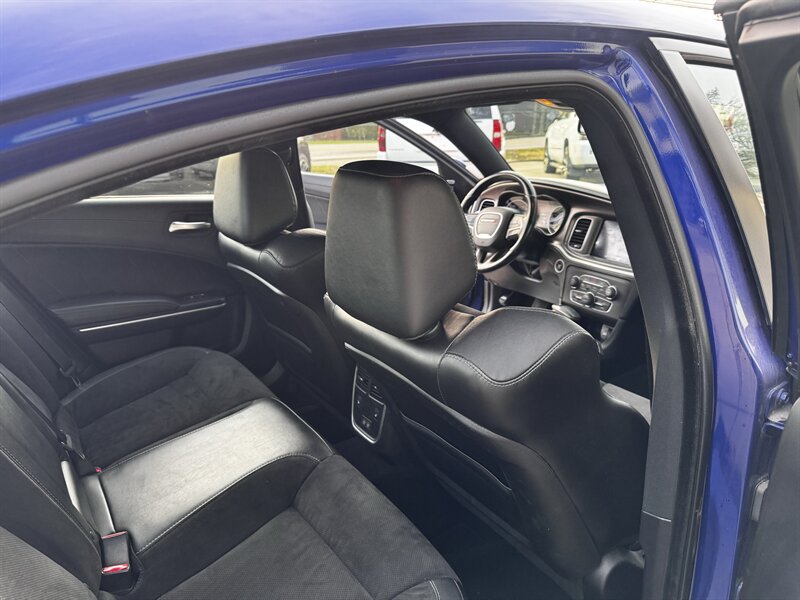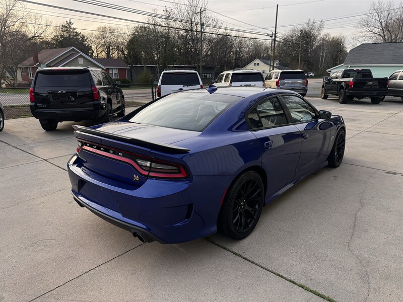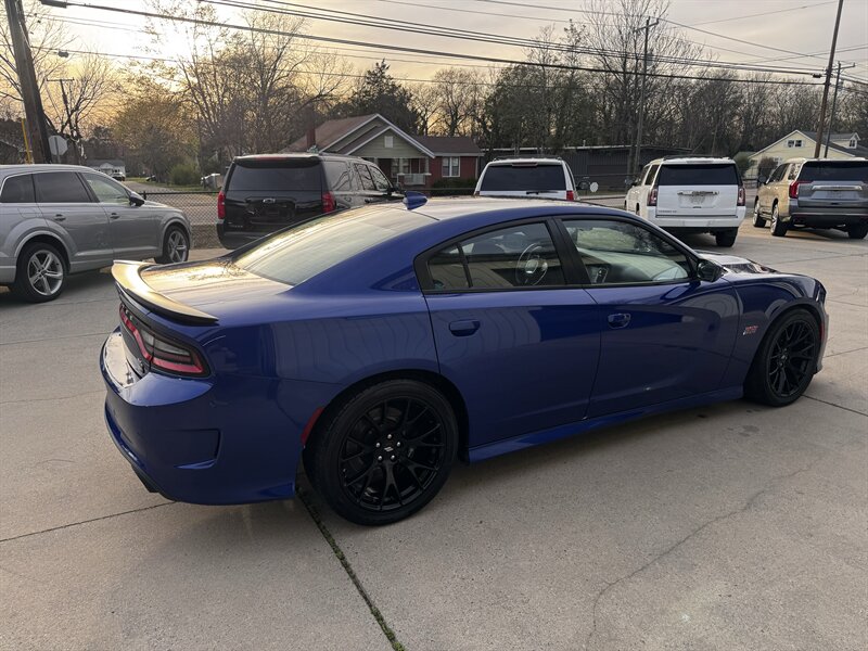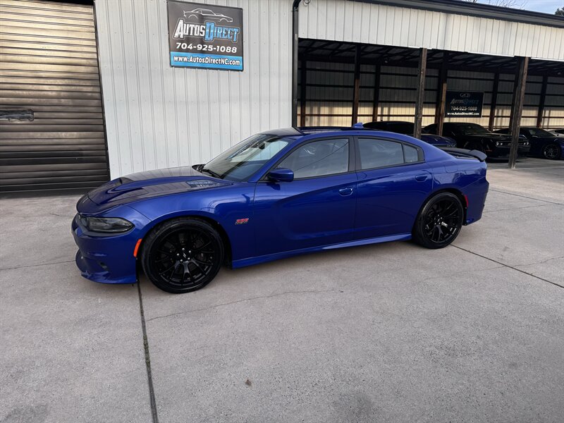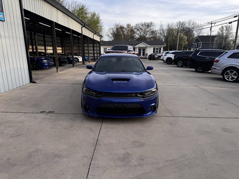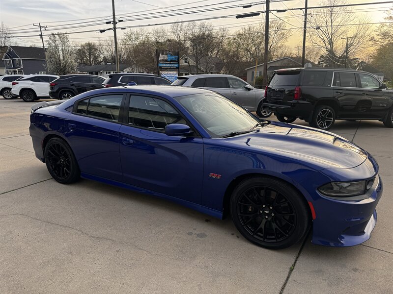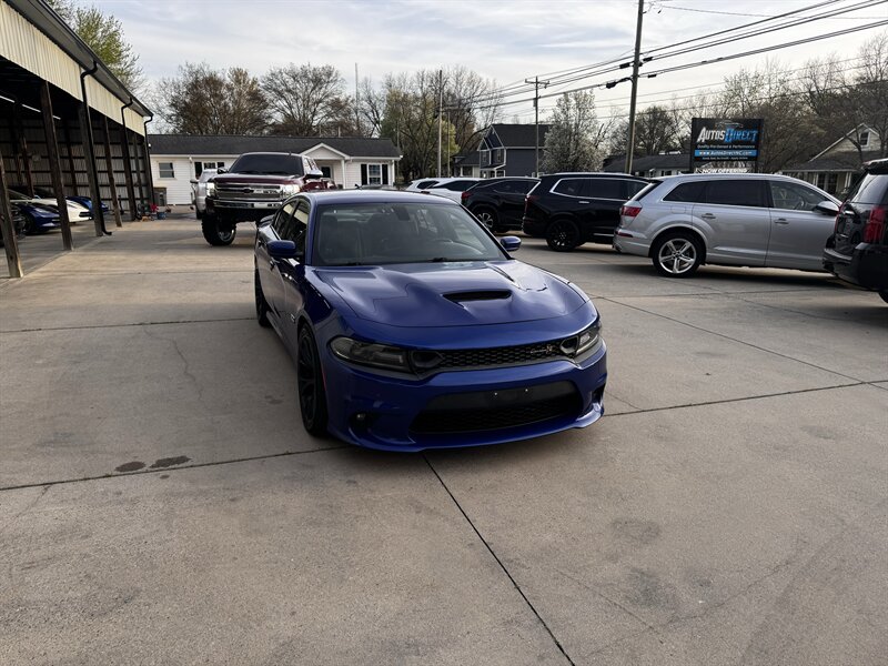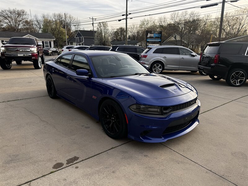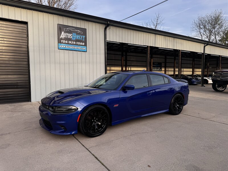 2019 Dodge Charger R/T Scat Pack — B5 Blue Pearl Coat exterior, Black interior with only one owner and a clean CarFax. HEMI 6.4L V8 producing 485 hp and 475 lb-ft, mated to an 8-speed automatic (RWD) — EPA 15 MPG city / 24 MPG highway. Factory-built for fury: performance-tuned suspension, factory Brembo performance brakes, limited-slip differential, performance exhaust with launch-control/line-lock capability, staggered 20-inch performance wheels and tires. Tech and convenience straight from the factory: Uconnect touchscreen with Apple CarPlay/Android Auto, dual-zone automatic climate control, push-button start/keyless entry, sport seats with leather accents, rearview camera and full stability/traction control suite. Excellent overall condition, Ready to dominate the road.