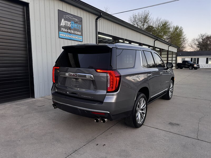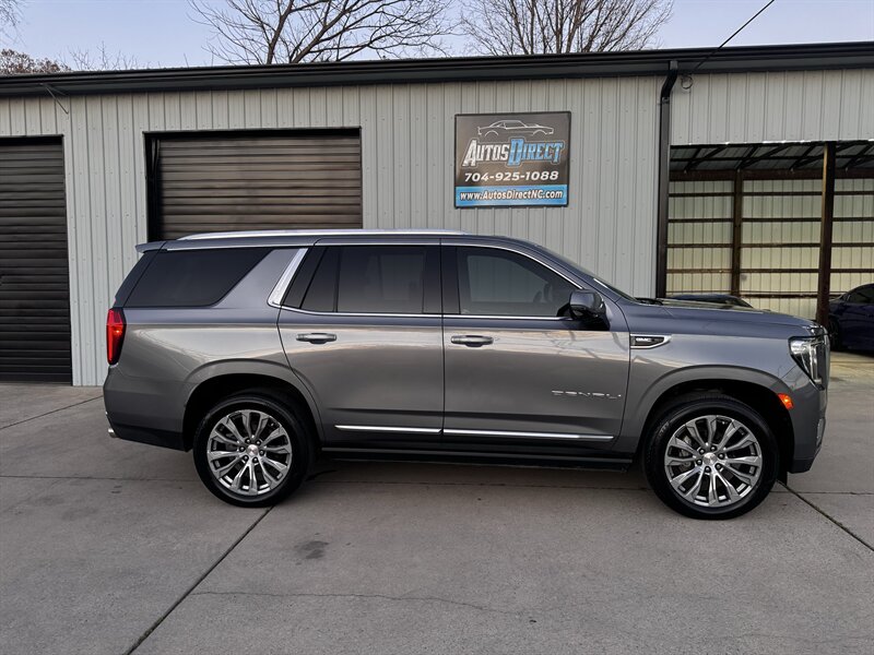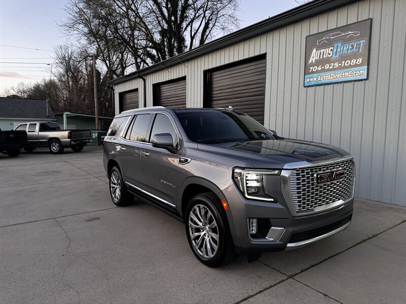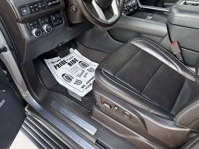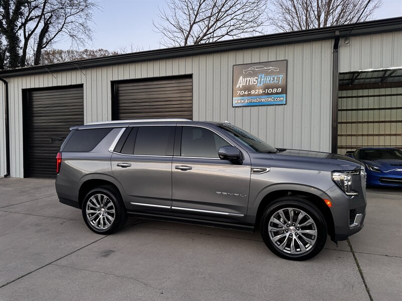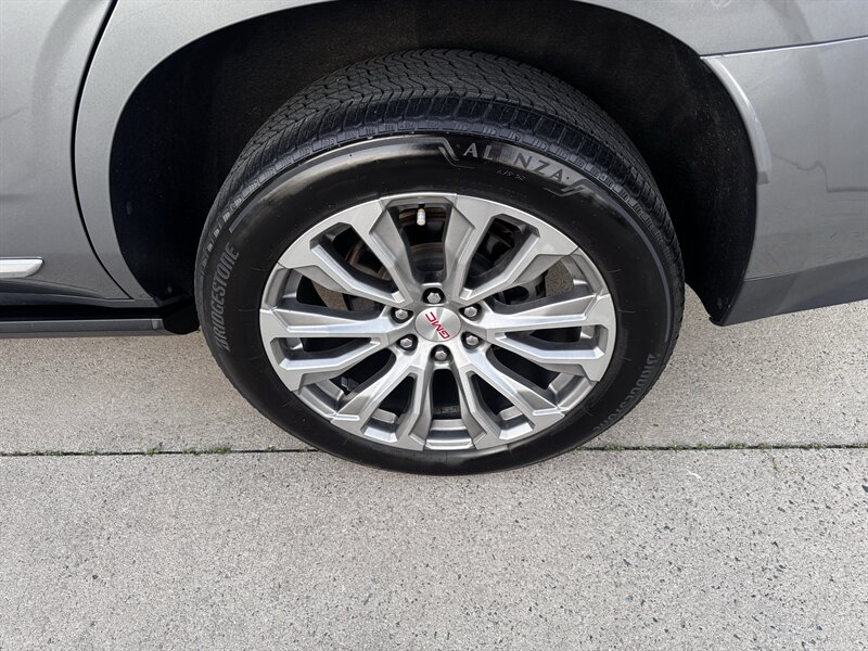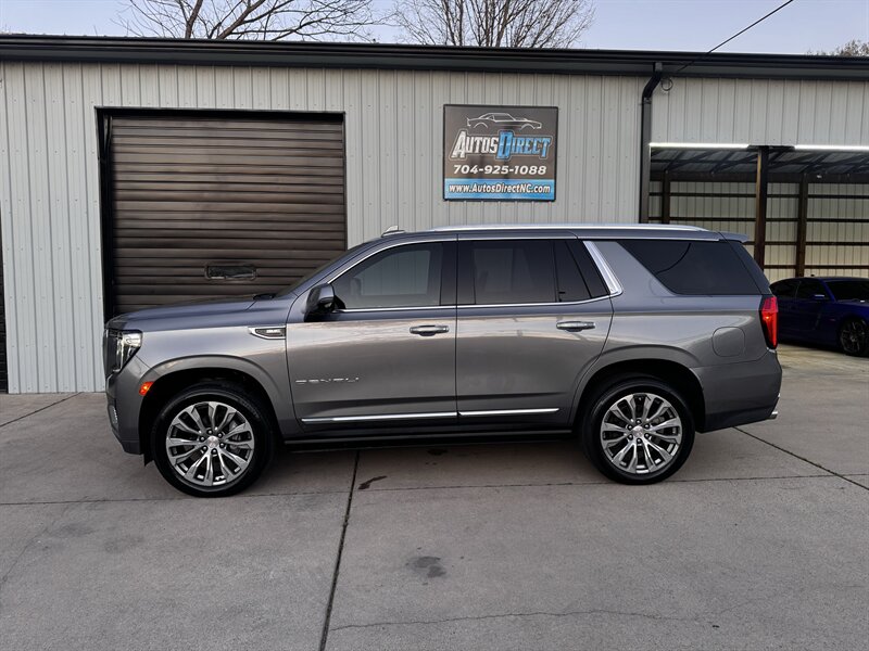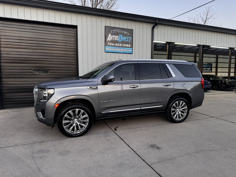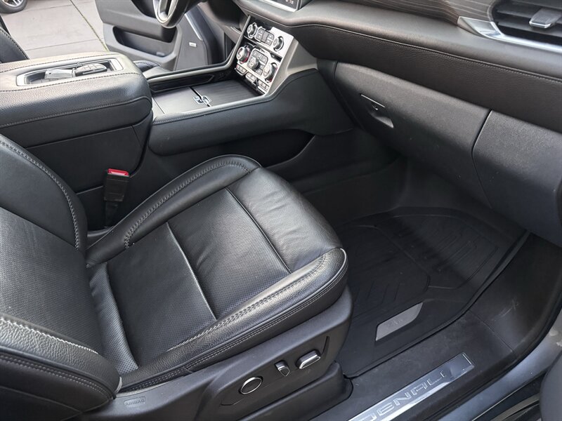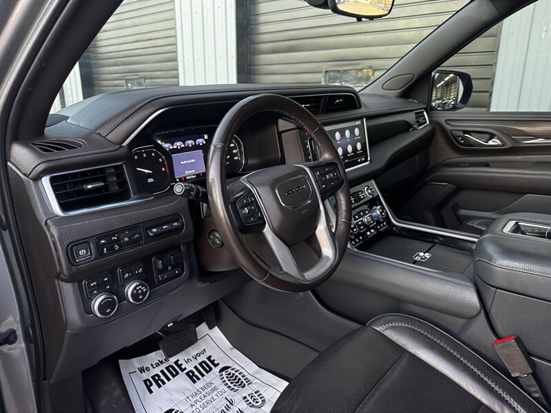 2021 GMC Yukon Denali in Smokey Quartz Metallic with a Jet Black interior, powered by the EcoTec3 6.2L V8 (420 hp, 460 lb-ft) mated to a 10-speed automatic — EPA-rated at 13 MPG city and 19 MPG highway. Factory-standard Denali equipment includes premium leather-appointed seating with heated and ventilated front seats, heated steering wheel, power-adjustable front seats with memory, tri-zone automatic climate control, Bose premium audio, a large touchscreen infotainment system with Apple CarPlay/Android Auto and navigation, rear entertainment package with t.v.'s, wireless charging, keyless entry with remote start, and a hands-free power liftgate. Advanced safety and driver-assist features come standard as well, such as adaptive cruise control, forward collision alert with automatic emergency braking, blind-spot monitoring with rear cross-traffic alert, and a surround/HD camera system with trailering technologies. This one-owner Yukon Denali is in excellent overall condition with a clean CARFAX.