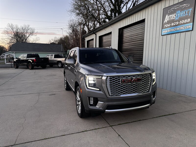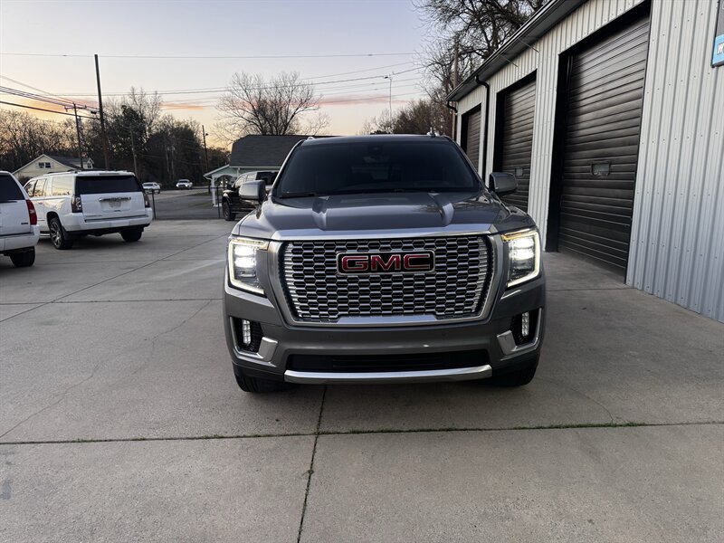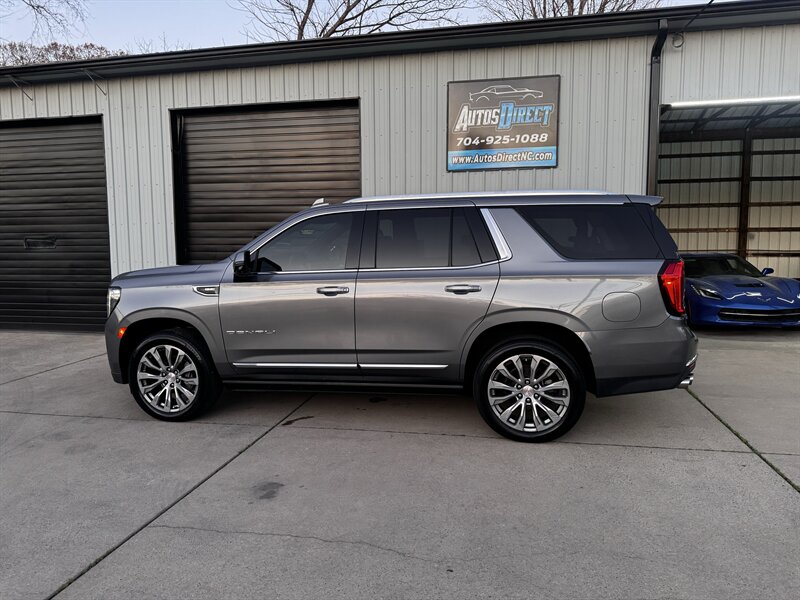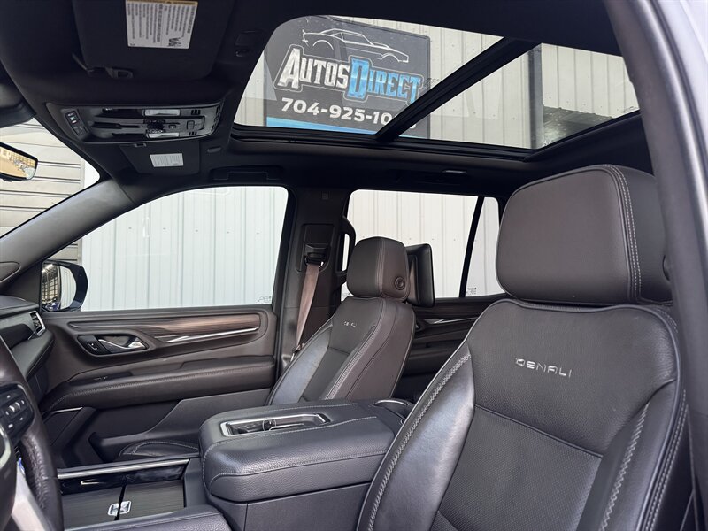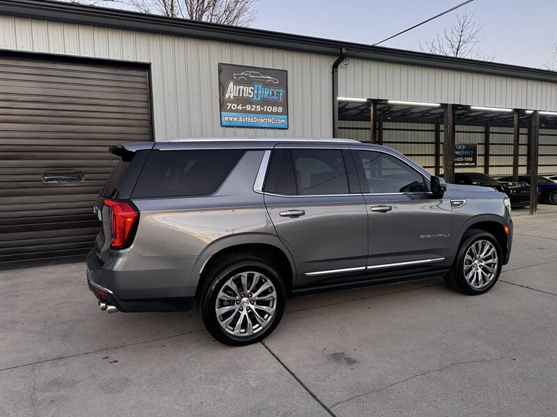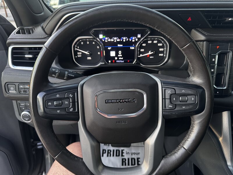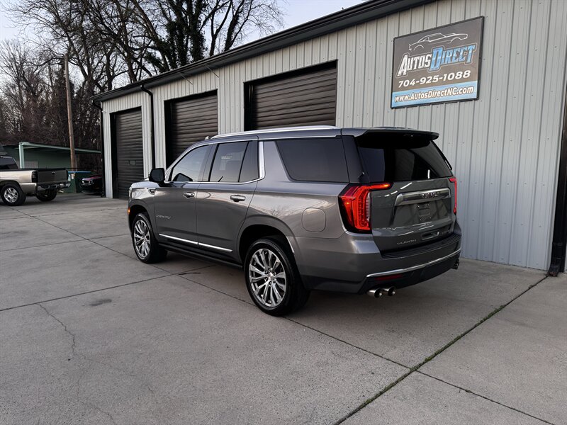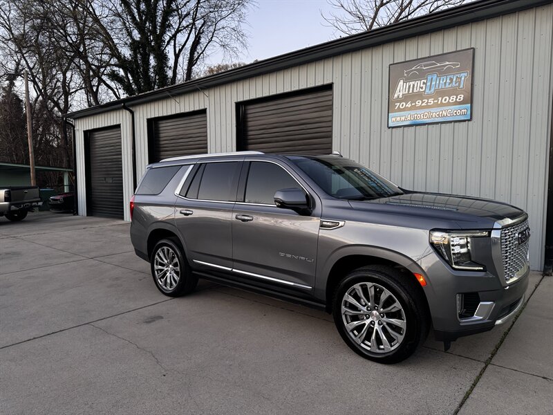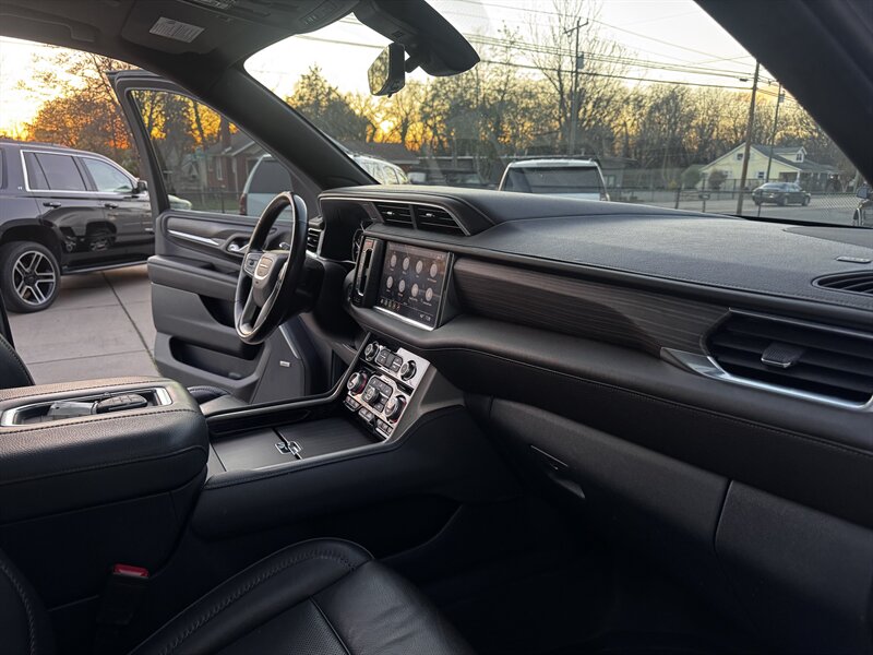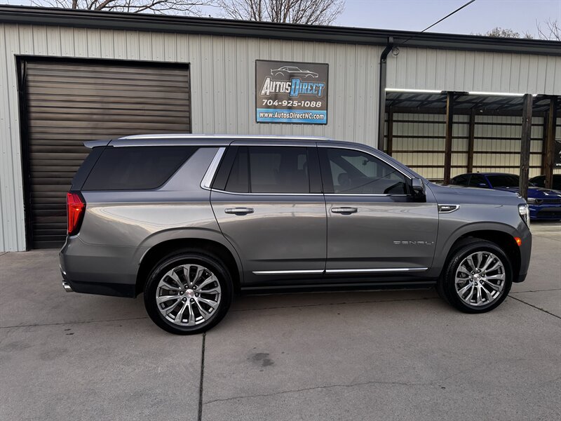 2021 GMC Yukon Denali in Smokey Quartz Metallic with a Jet Black interior, powered by the EcoTec3 6.2L V8 (420 hp, 460 lb-ft) mated to a 10-speed automatic — EPA-rated at 13 MPG city and 19 MPG highway. Factory-standard Denali equipment includes premium leather-appointed seating with heated and ventilated front seats, heated steering wheel, power-adjustable front seats with memory, tri-zone automatic climate control, Bose premium audio, a large touchscreen infotainment system with Apple CarPlay/Android Auto and navigation, rear entertainment package with t.v.'s, wireless charging, keyless entry with remote start, and a hands-free power liftgate. Advanced safety and driver-assist features come standard as well, such as adaptive cruise control, forward collision alert with automatic emergency braking, blind-spot monitoring with rear cross-traffic alert, and a surround/HD camera system with trailering technologies. This one-owner Yukon Denali is in excellent overall condition with a clean CARFAX.
