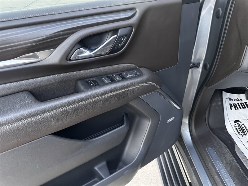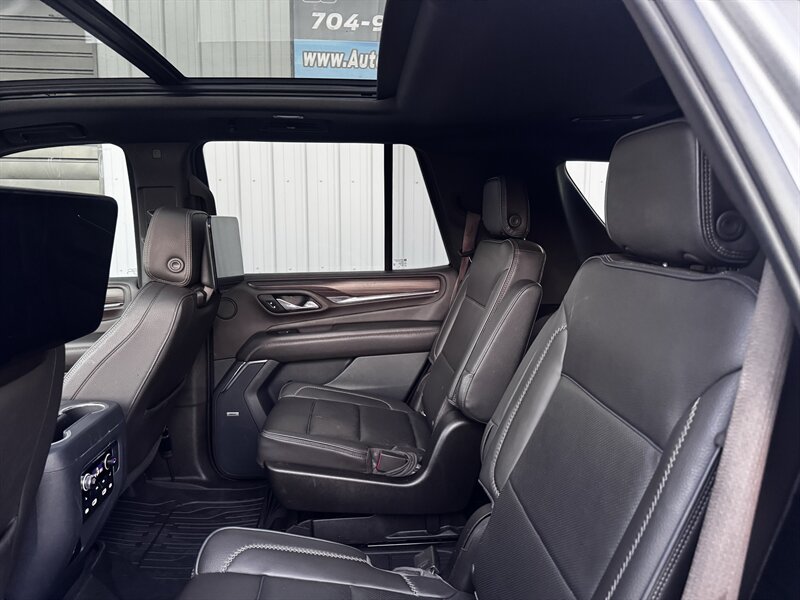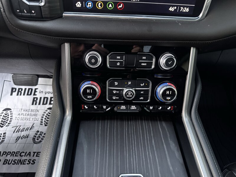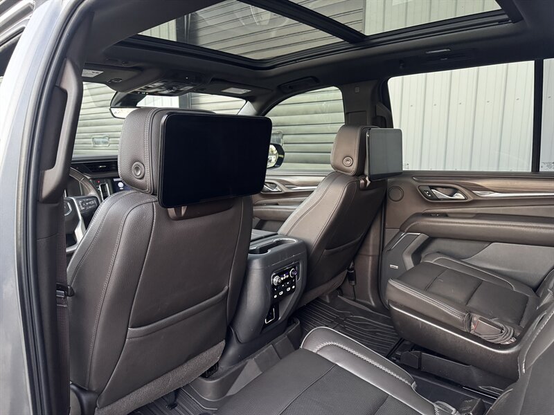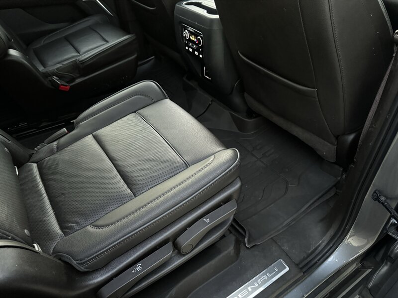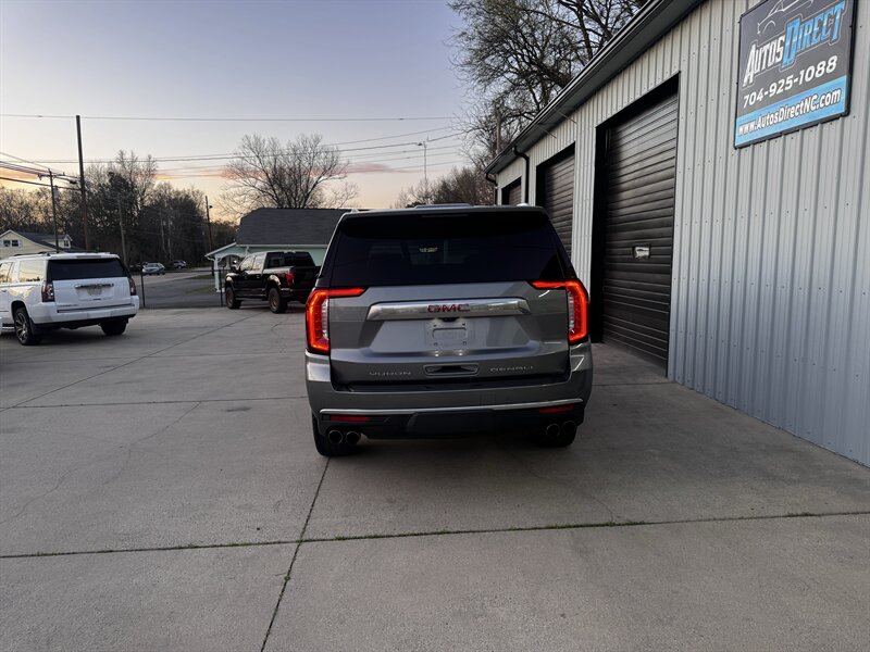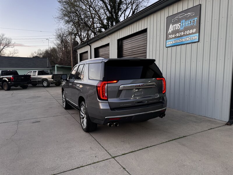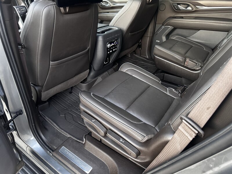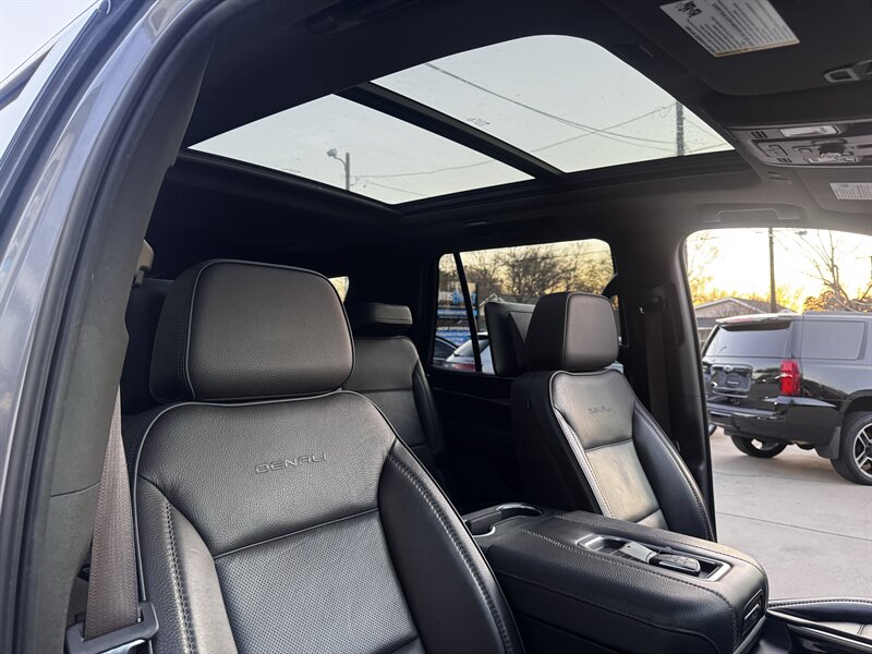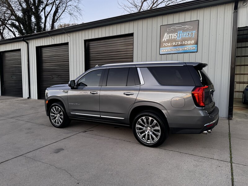 2021 GMC Yukon Denali in Smokey Quartz Metallic with a Jet Black interior, powered by the EcoTec3 6.2L V8 (420 hp, 460 lb-ft) mated to a 10-speed automatic — EPA-rated at 13 MPG city and 19 MPG highway. Factory-standard Denali equipment includes premium leather-appointed seating with heated and ventilated front seats, heated steering wheel, power-adjustable front seats with memory, tri-zone automatic climate control, Bose premium audio, a large touchscreen infotainment system with Apple CarPlay/Android Auto and navigation, rear entertainment package with t.v.'s, wireless charging, keyless entry with remote start, and a hands-free power liftgate. Advanced safety and driver-assist features come standard as well, such as adaptive cruise control, forward collision alert with automatic emergency braking, blind-spot monitoring with rear cross-traffic alert, and a surround/HD camera system with trailering technologies. This one-owner Yukon Denali is in excellent overall condition with a clean CARFAX.