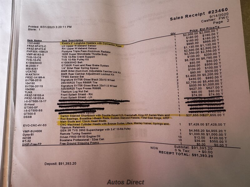 2015 Ford Mustang GT Premium 50th Anniversary — Black exterior, Raven Black leather, supercharged 5.2L built by Evolution Performance with and tuned by Lund, sleeved block ($28k) delivering 1,104 rwhp on E85 and 902 ft-lbs with over $100,000 in receipts, build pictures, dyno sheet. With less than 1000 miles on build, this beast has a Tremec Magnum XL Transmission, Carbon Fiber Drive Shaft, GT 500 Brakes & Suspension, VMP Supercharger, & tons of upgrades (to much to list). This loaded, low-mileage beast (under 26,000 miles, <3,000/yr) comes with the 50 Years Appearance Package, Enhanced Security Package, Equipment Group 401A and the GT Performance Package, plus All-Weather Floor Mats, Spoiler Delete, Adaptive Cruise w/ Collision Warning & Rain-Sensing Wipers, Reverse Sensing, Voice-Activated Navigation and 20" Foundry Black machined wheels. Factory standard equipment (detailed): anti-lock brakes, full stability & traction control suite, multiple airbags and tire pressure monitoring; premium leather-trimmed sport seats with heating/ventilation, dual-zone automatic climate control, MyFord infotainment with Bluetooth/voice controls and upgraded audio, power windows/locks/mirrors and keyless entry, and the S550-era independent rear suspension for sharp handling. excellent overall condition and clean CARFAX — this isn’t a sleeper, it’s a statement. Don't miss your chance to own this high hp street car built with no expense spared!