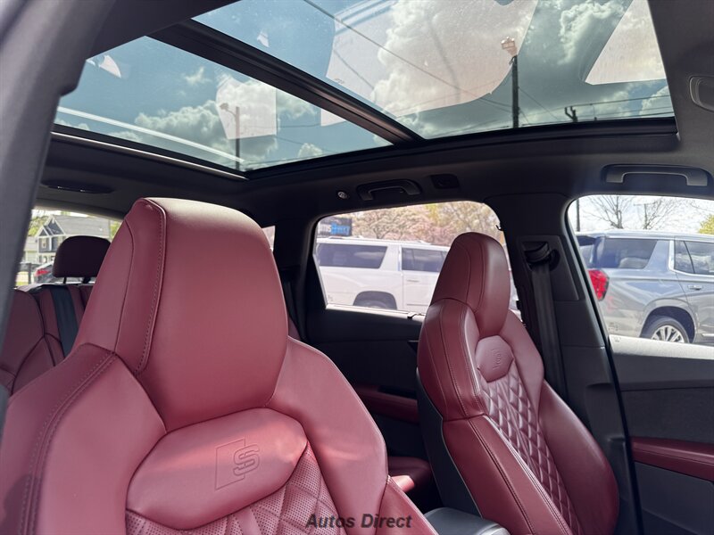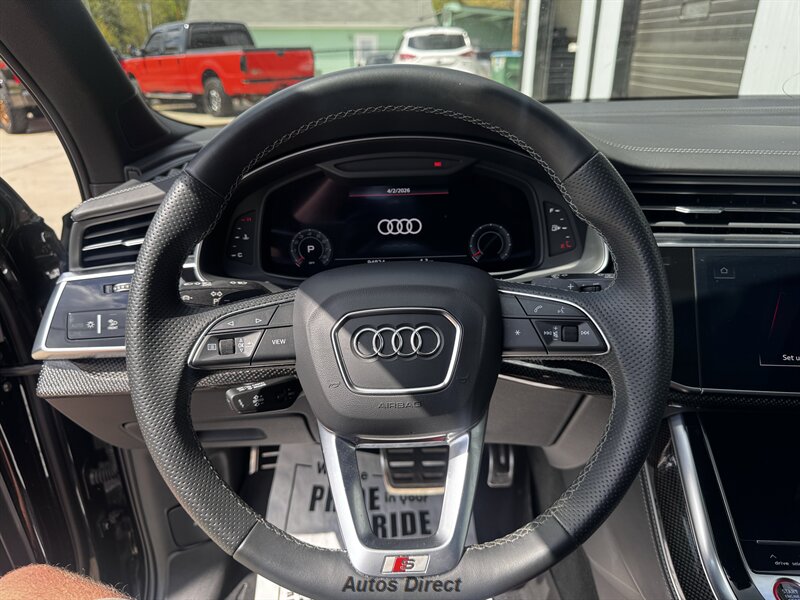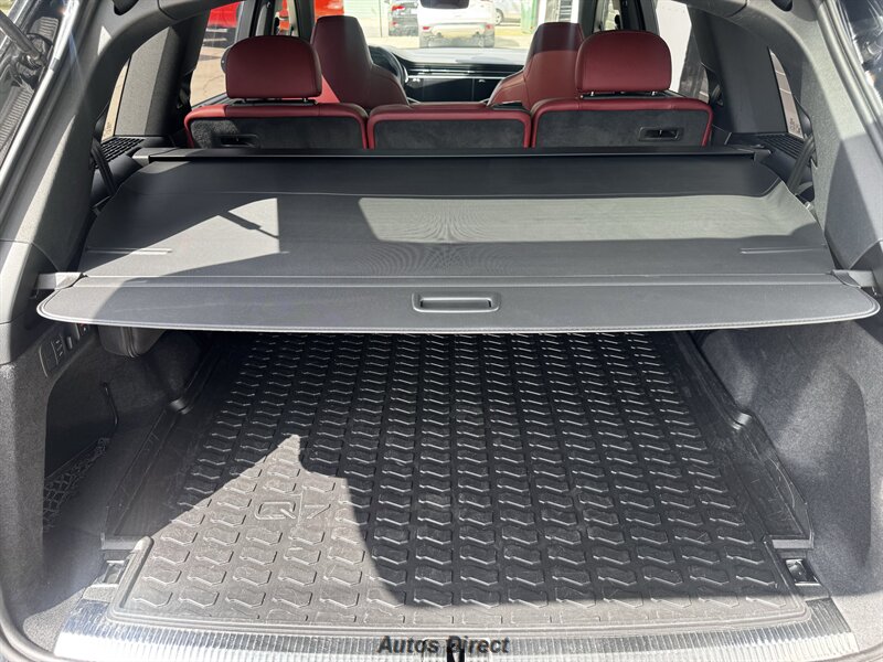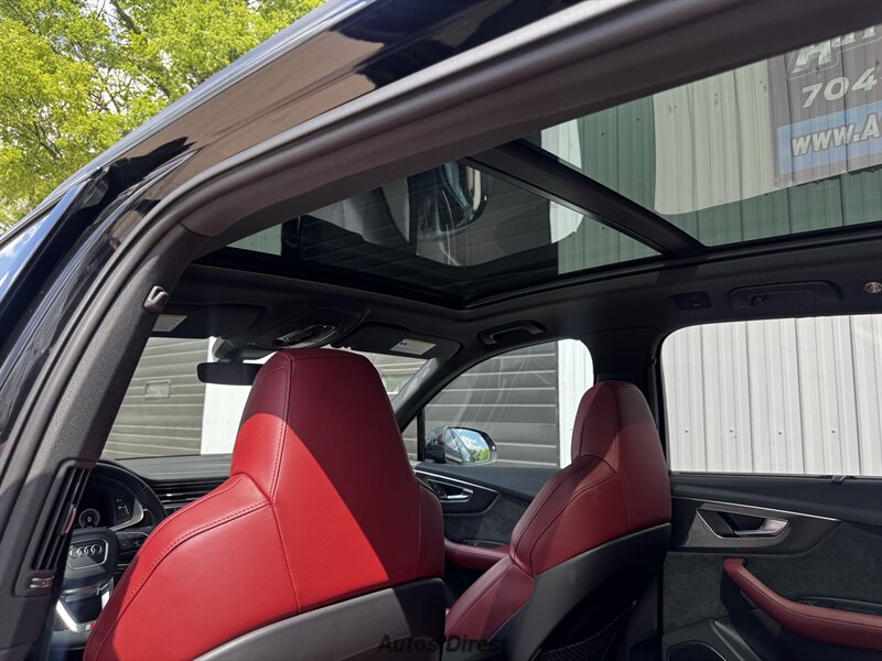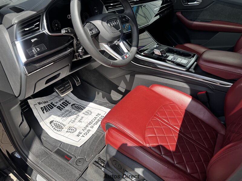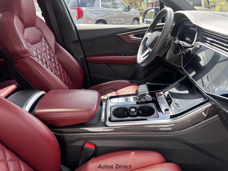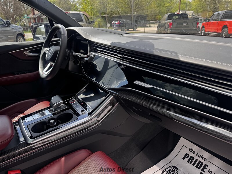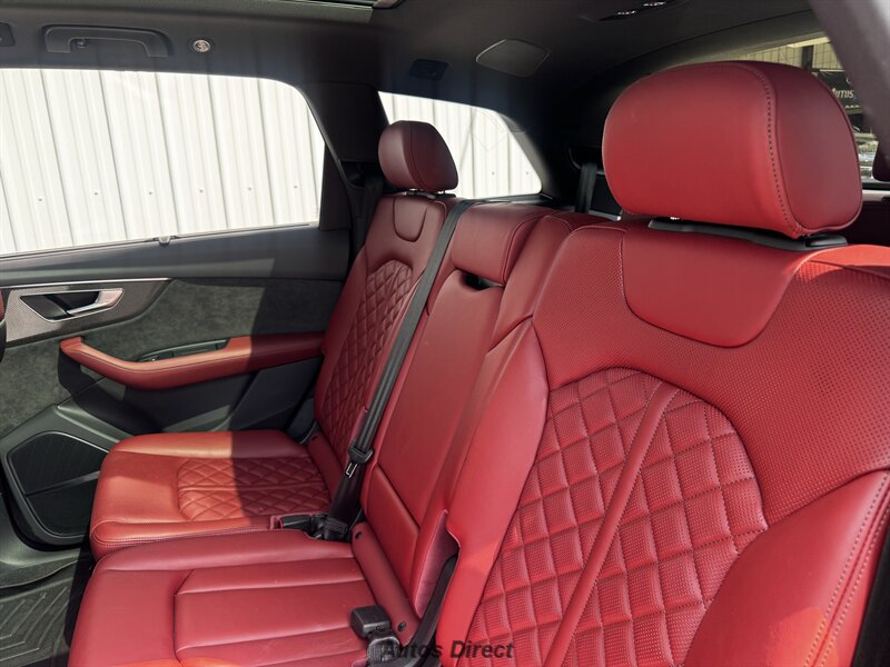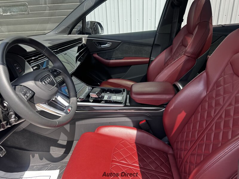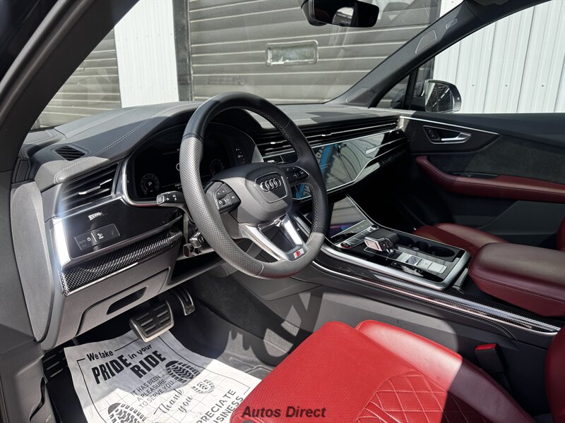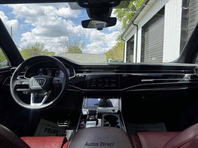 You want performance and presence? Here it is: a one-owner, clean-CARFAX 2022 Audi SQ7 4.0T quattro Prestige in Mythos Black Metallic with Arras Red interior and Anthracite stitching — excellent overall condition and ready to dominate. Powertrain and economy: 4.0L Twin-Turbo V8 delivering 500 hp and 568 lb-ft, paired to an 8-speed Tiptronic and quattro all-wheel drive — EPA-rated 15 MPG city / 21 MPG highway. Included packages: Black Optic, Luxury and S Sport. Options included: Bang & Olufsen Advanced 3D Sound, red painted brake calipers, Audi Guard cargo mat, black Audi rings/badges, Mythos Black paint and first aid kit. Factory features in detail: Audi MMI Navigation Plus with dual touch displays and Audi Virtual Cockpit digital driver display; head-up display; adaptive air suspension with adjustable dampers and selectable drive modes; LED Matrix headlights with adaptive high-beam; premium Valcona leather upholstery, power multi-contour front seats with memory, heated/ventilated front seats, 3-zone automatic climate control and panoramic sunroof; power liftgate, top-view camera and parking sensors, adaptive cruise with lane assist, Audi pre sense advanced safety suite, and third-row seating — everything you need to attack the road in comfort and confidence. Act fast — this SQ7 in this color combo won't last long!